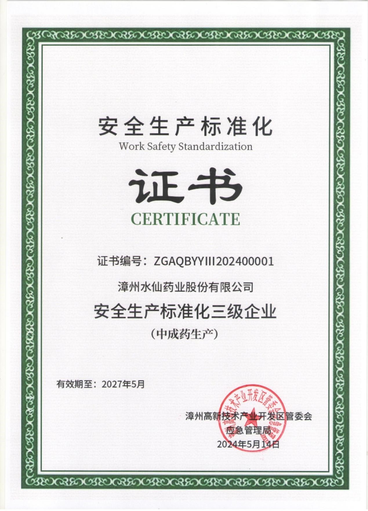 漳州水仙成功取得“安全生產(chǎn)標(biāo)準(zhǔn)化三級(jí)企業(yè)證書”